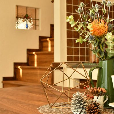 こちらは、来月に三重県松阪市大黒田町で完成見学会を開催しますお宅のテーブルコーディネート。ディープグリーンの花器にオレンジ色のピンクッションの花がとても映えてたっぷりと秋色を感じますね。