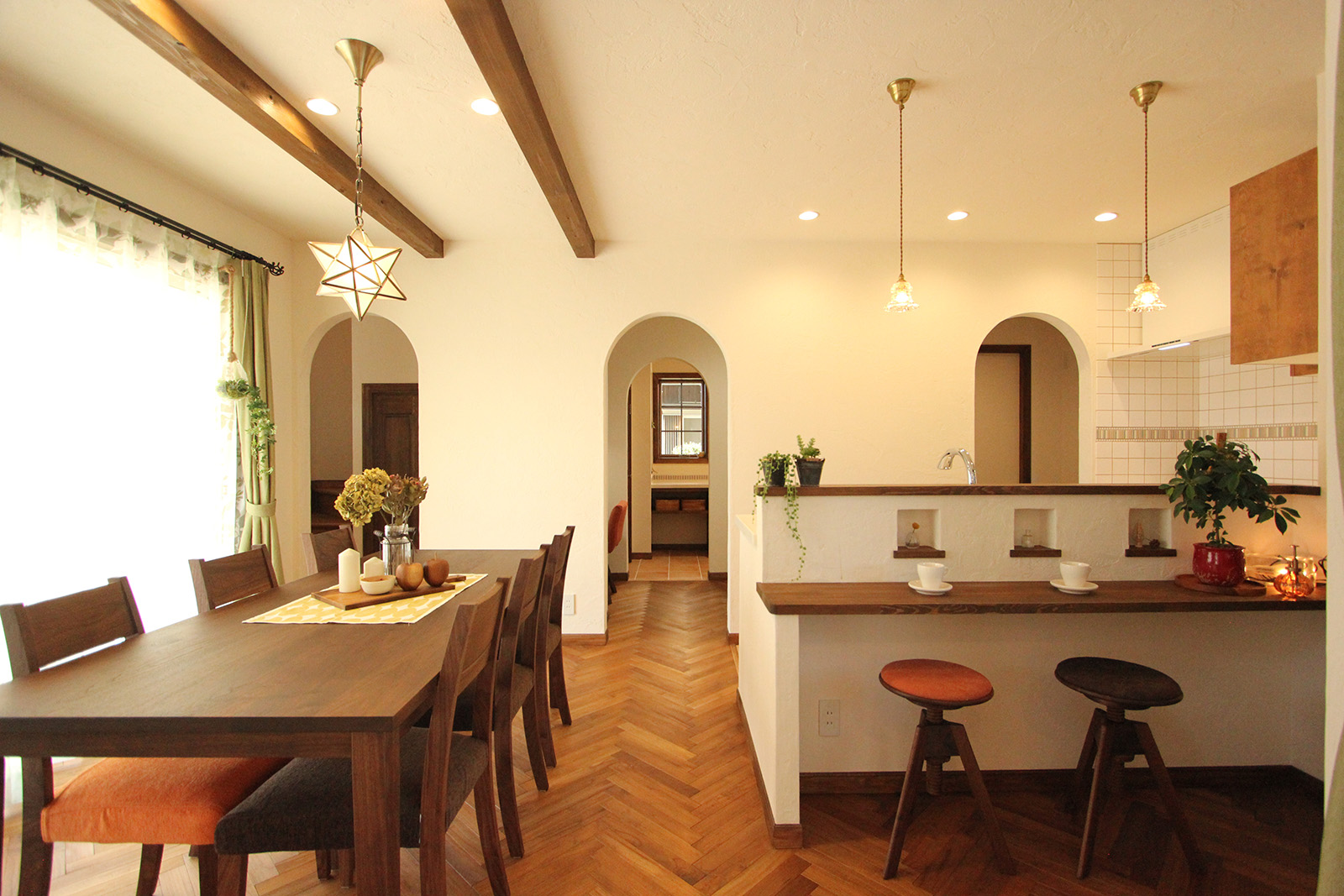 アーチの開口が並ぶユニークな間取り。ヘリンボーンのフローリングがさりげなくおしゃれ。