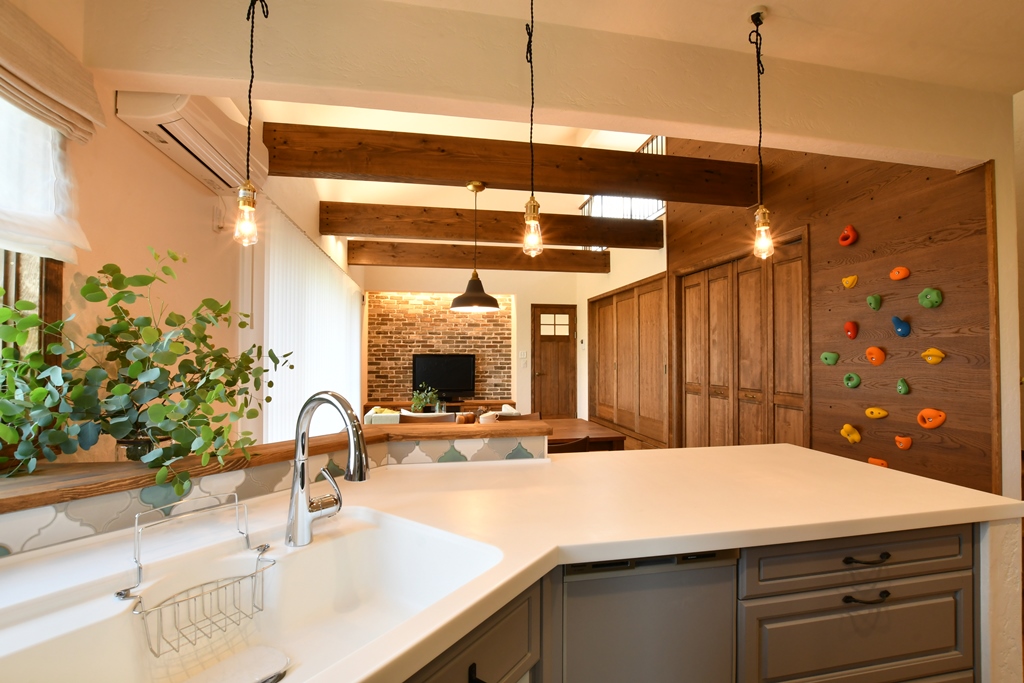 傾斜天井に取り付けた梁がアクセントとなったLDKはいつでも家族の気配を感じれる