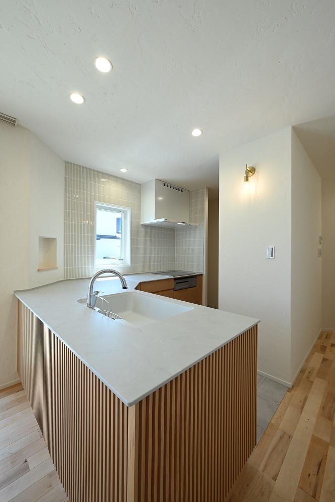 キッチンはオリジナルのA型キッチン天板はグレーで壁は一部をストライプタイルを貼りました、収納扉は縦ラインの凹凸加工でモダンな感じでかっこいいです。