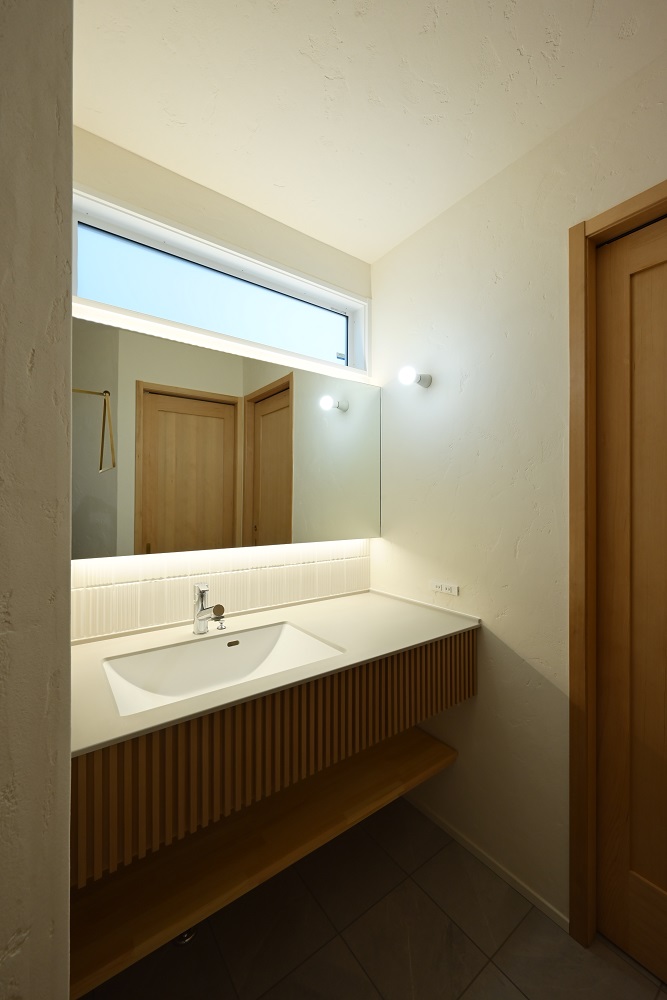 洗面スペースはオーダーの大型ミラーを設置ミラーの上下には間接照明を設置、眩しくない明るさの確保とやっぱりおしゃれですよね、前板のデザインはキッチンとおそろいで統一感を演出。