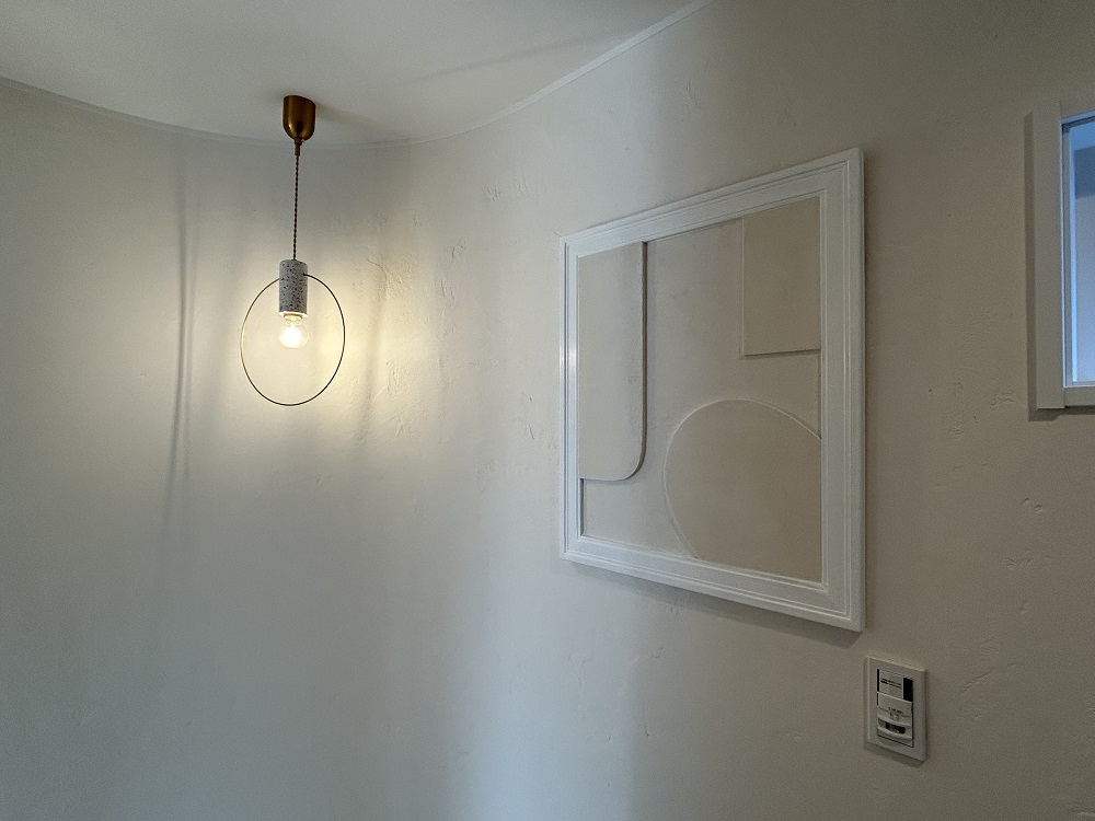玄関にはおしゃれな照明とプロホーム・大台の会長の力作の漆喰アートが飾られギャラリーのような空間。