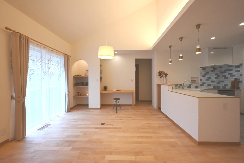 さて、菰野町にて新築工事をさせていただいているお宅の完成写真を撮影させていただきました。アール壁が印象的なA型キッチンやロフトが見どころの平屋のお家です。3月14日15日には完成見学会も予定しておりますのでぜひご見学ください。
