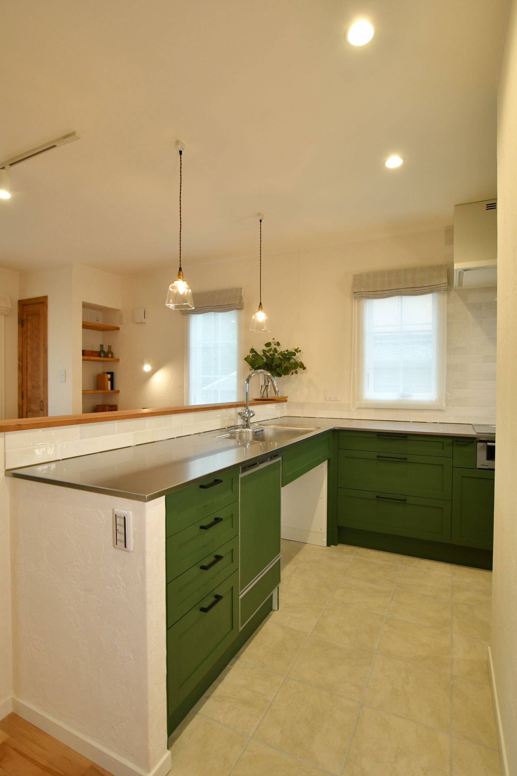 1000色以上ある中から選べるキッチン扉のカラーはお気に入りのグリーンを採用。収納力や機能性も充実した、世界でたったひとつだけのオリジナルキッチンが完成しました。