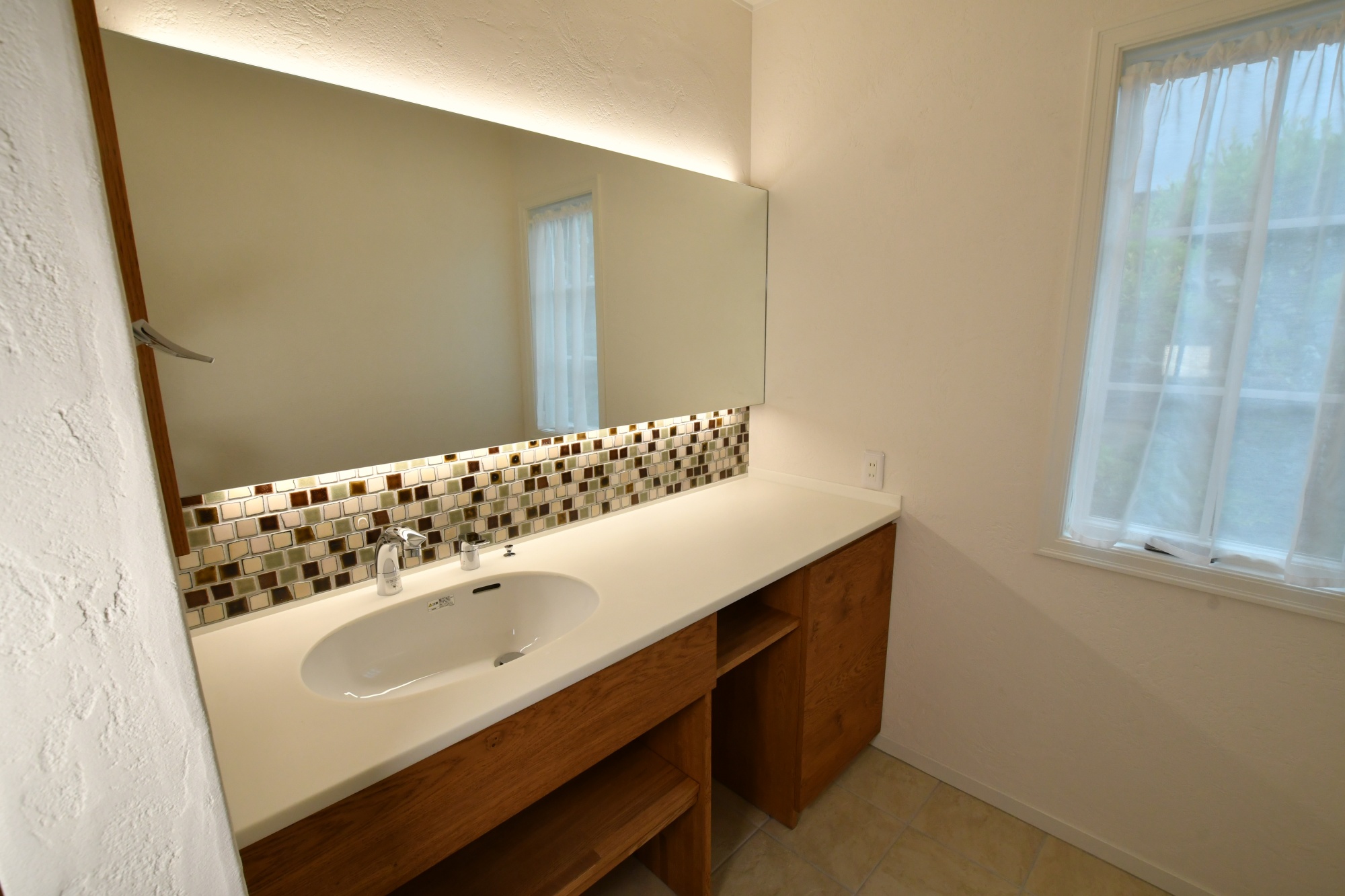 間接照明で明るく清潔感のある洗面化粧台。