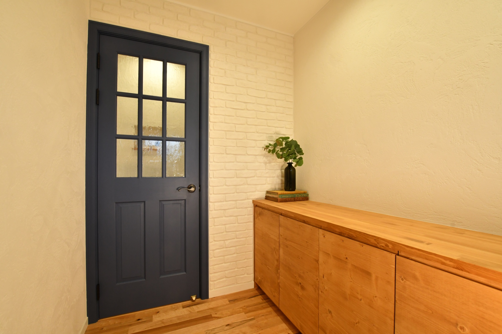 ネイビーのドアと塗り壁を型押しして仕上げたレンガスタンプの壁が印象的な玄関ホール。
