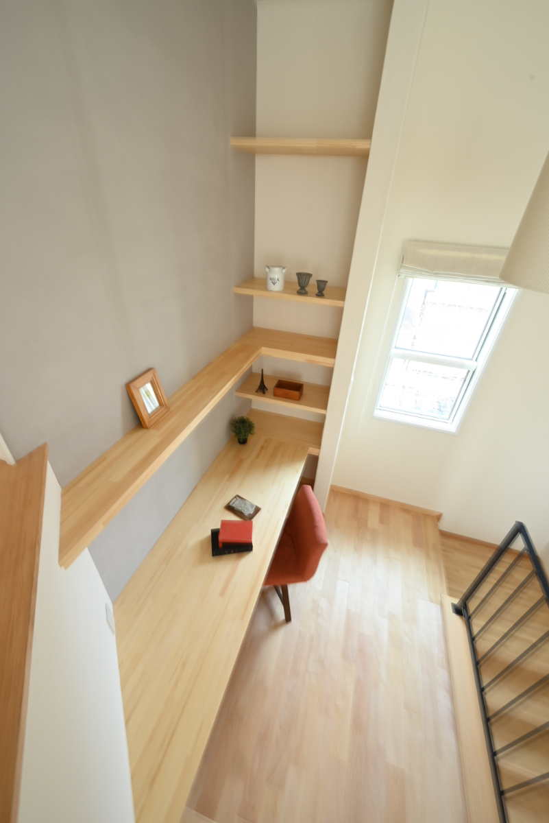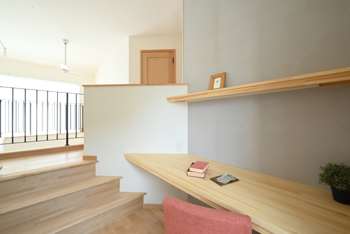 一階と二階をつなぐ階段の中間層にワークスペースを設けました。設計当初から施主様のご要望で、イメージ通りのスペースを造ることができました。