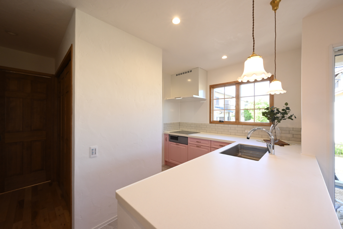 散らかりやすいカップボードは奥に配置し、リビングから見えなくすることですっきりした印象を与えることが出来ます。