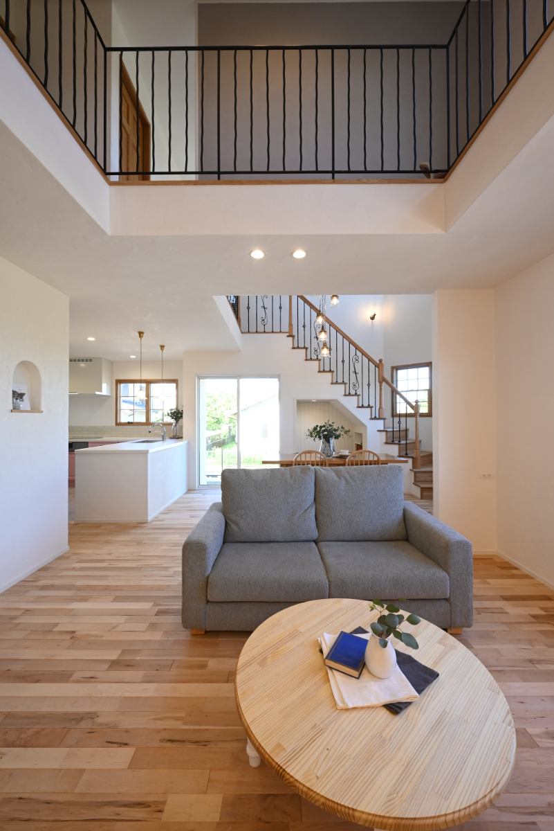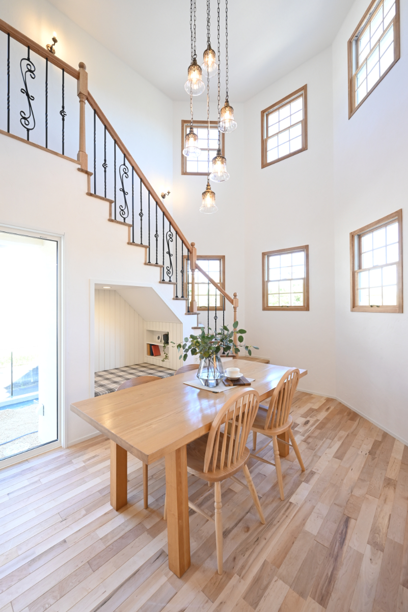 塔屋部分を這うように設置した階段や吹き抜けの天井からつるした照明などお城のようなデザイン。