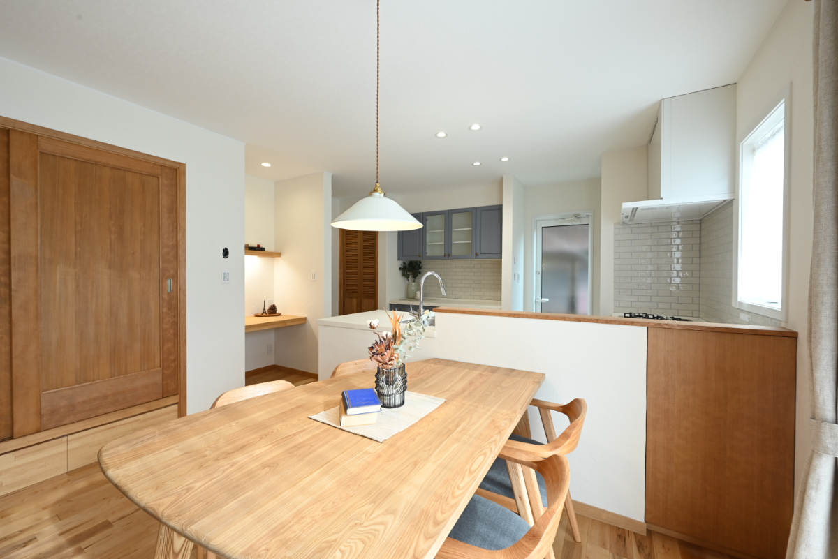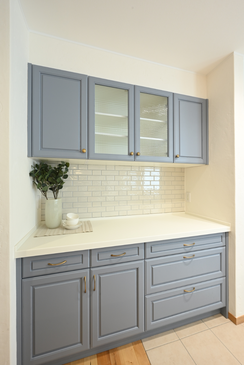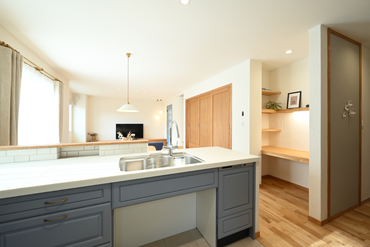 背面にはカップボードもオーダーメイドで作成。キッチンのデザインに合わせて作るためお家のデザインを損ねることはありません。