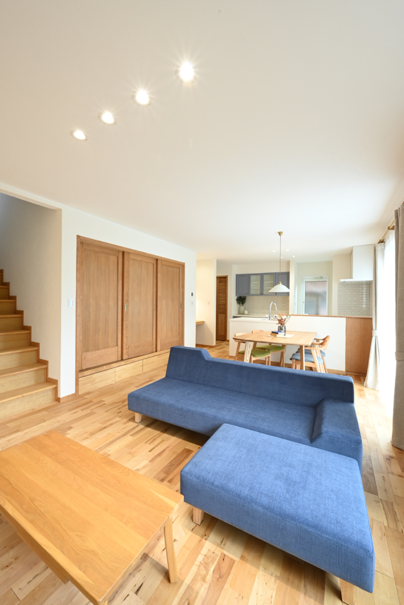 壁は塗り壁(エスタコウォール)、床は天然木(メープル)を使用。照明やソファーなどトータルコーディネートしご提案しています。