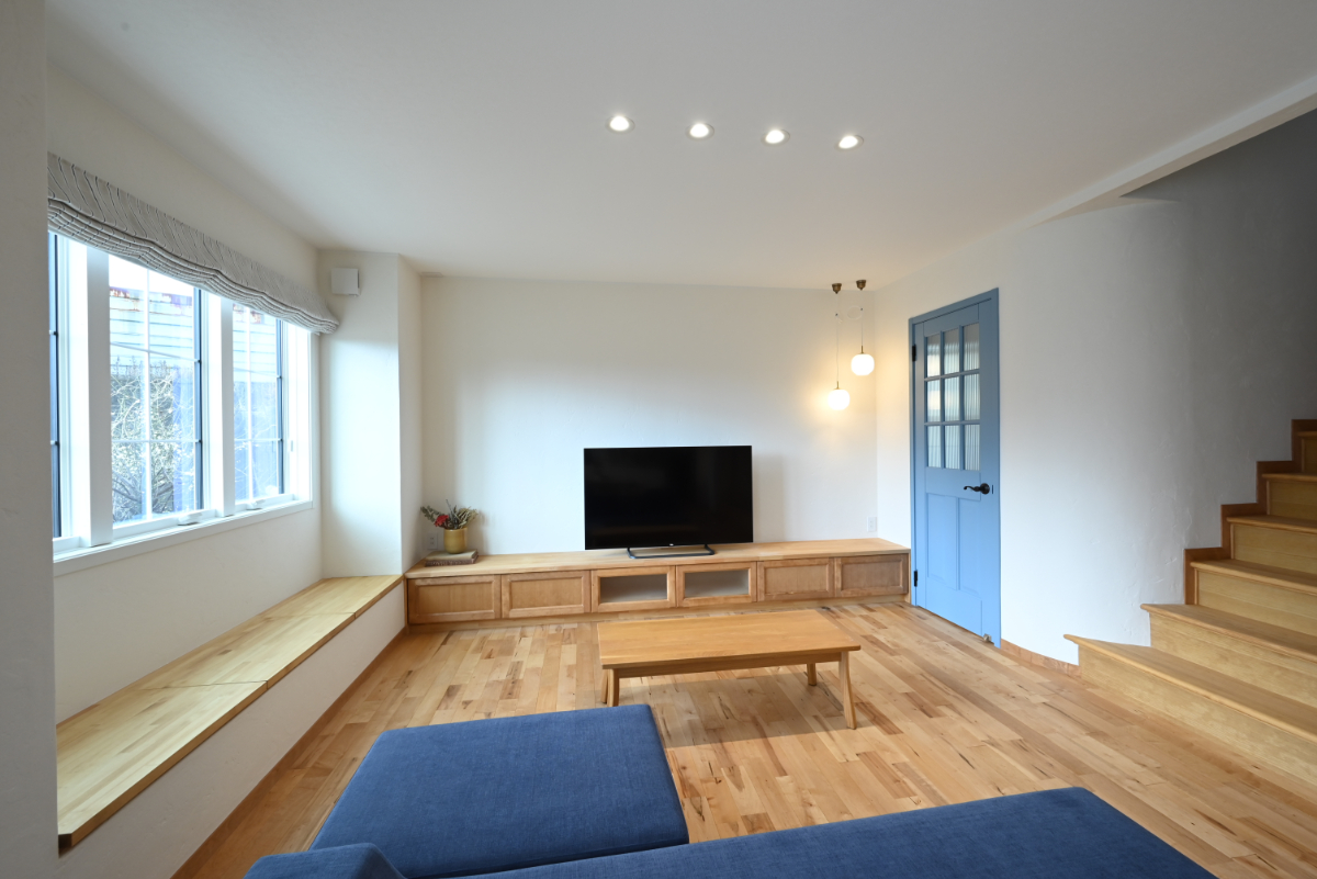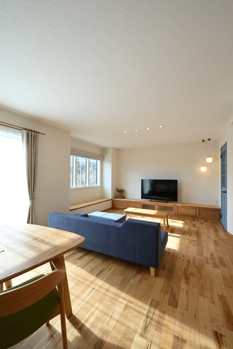 塗り壁(エスタコウォール)と天然木(メープル)の床に合わせて造作家具も天然木を利用して造っています。