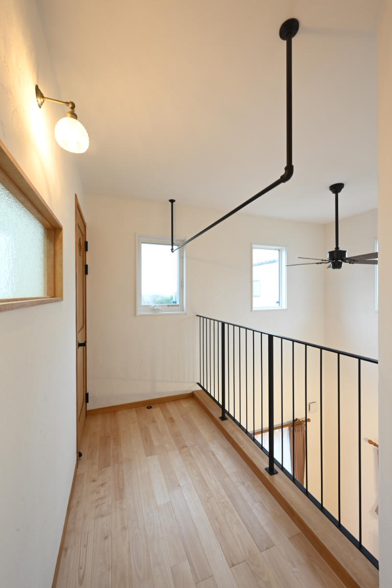 2階のホールには洗濯物が干せるように、アイアン手すりと合わせたおしゃれな物干しバーを取付。