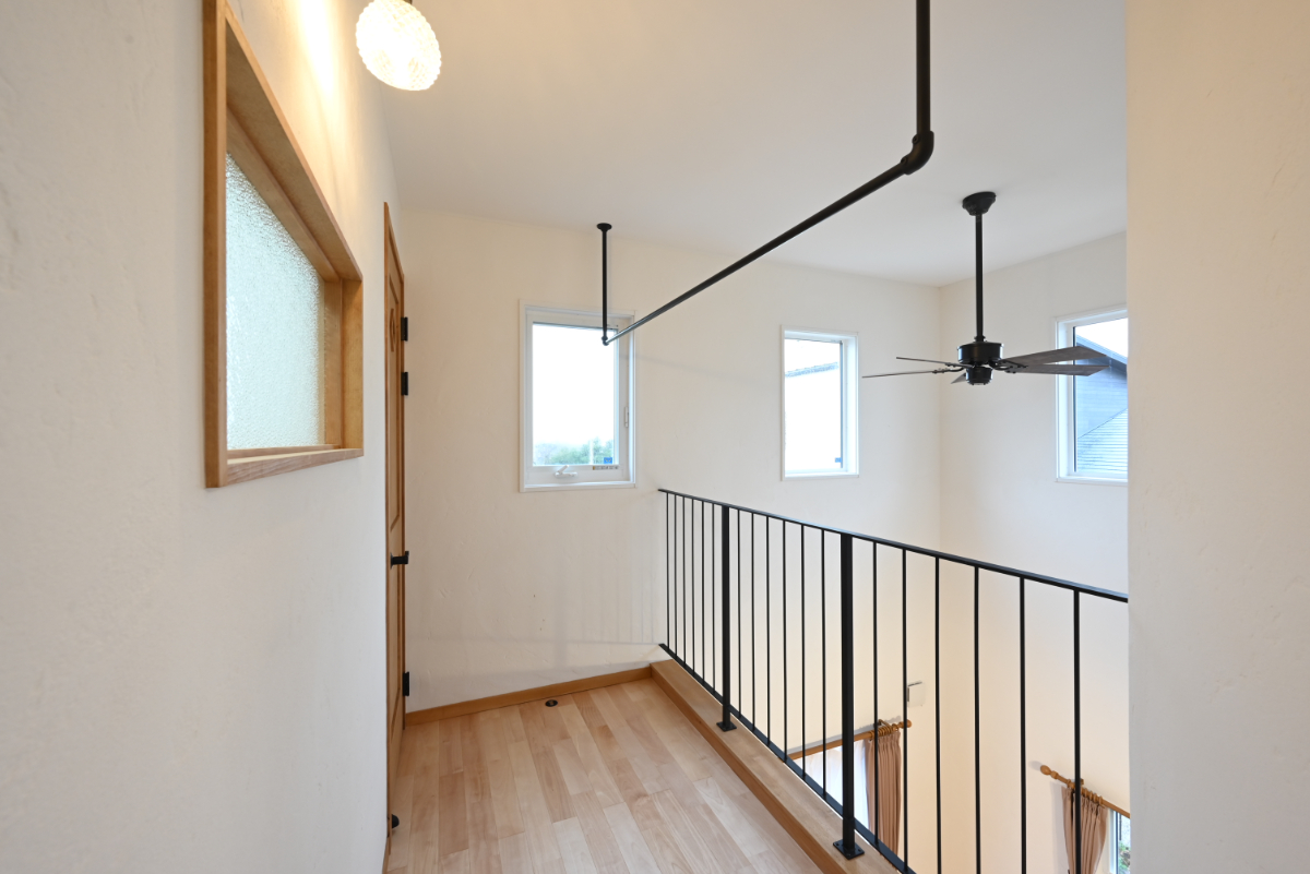 2階のホールには洗濯物が干せるように、アイアン手すりと合わせたおしゃれな物干しバーを取付。